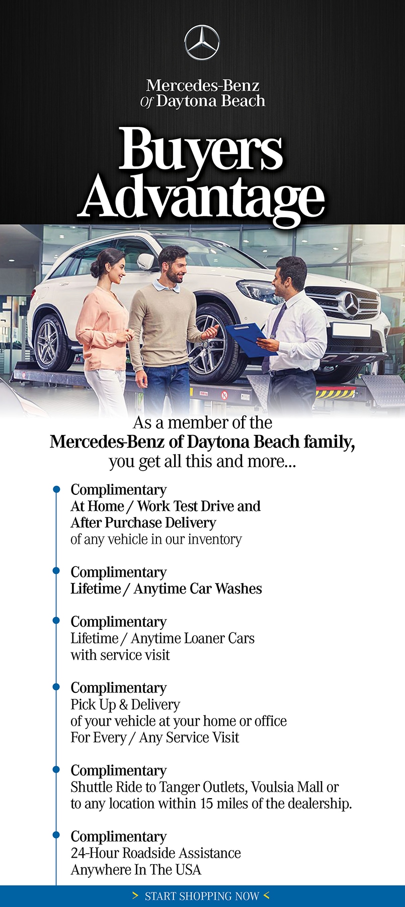 At Home/Work after purchase delivery available when you purchase a vehicle only at Mercedes-Benz of Daytona Beach, see dealer for details. Car Washes are available at every service visit; includes basic exterior car wash. Loaner Cars are available on a first come, first served basis; available when your vehicle is required to be in our service department for 3 or more hours of labor; reservation of loaner car is required at time of appointment setting. Pick Up & Delivery of your vehicle at your home or office is available when your vehicle is required to be in our service department for 3 or more hours of labor, see dealer for details. Shuttle Service available during regular service hours within 15 mile radius of the dealership when vehicle is at dealership for service. 3 Day Exchange Policy: Available on New and Pre-Owned Vehicles; Vehicle must be returned within 72 hours of purchase date with no more than 300 additional miles with no alterations or damage; vehicle may be exchanged for another vehicle from dealer stock only. Roadside Assistance supplied by Mercedes-Benz USA only on new Mercedes-Benz vehicles purchased at Mercedes-Benz of Daytona Beach.