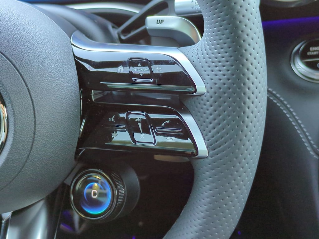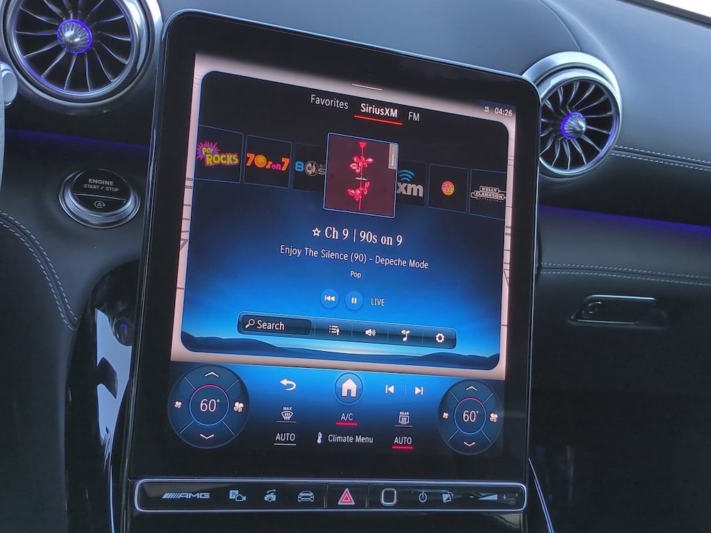 This vehicle Includes the Following Features and Options: 11 Speakers, 20" AMG® Twin 5-Spoke Wheels, 4-Wheel Disc Brakes, ABS brakes, Adaptive suspension, Air Conditioning, Alloy wheels, Android Auto®, Apple CarPlay®, Apple CarPlay®/Android Auto®, Auto High-beam Headlights, Auto tilt-away steering wheel, Auto-dimming door mirrors, Auto-dimming Rear-View mirror, Automatic temperature control, Black SoftTop, Brake assist, Bumpers: body-color, Burmester® Surround Sound System, Child-Seat-Sensing Airbag, Convertible roof lining, Convertible roof wind blocker, Delay-off headlights, Driver door bin, Driver vanity mirror, Dual front impact airbags, Dual front side impact airbags, Electronic Stability Control, Emergency communication system, Exterior Parking Camera Rear, Four wheel independent suspension, Front anti-roll bar, Front Bucket Seats, Front Center Armrest, Front dual zone A/C, Front reading lights, Garage door transmitter: HomeLink, Glass rear window, Heated & Ventilated Power Front Seats, Heated front seats, Heated steering wheel, High Performance Tires, Illuminated entry, Integrated roll-over protection, Knee airbag, Leather steering wheel, Low tire pressure warning, Memory seat, Nappa Leather Upholstery, Navigation System, Occupant sensing airbag, Outside temperature display, Overhead airbag, Overhead console, Panic alarm, Passenger door bin, Passenger vanity mirror, Power adjustable front head restraints, Power convertible roof, Power door mirrors, Power driver seat, Power passenger seat, Power steering, Power windows, Radio data system, Radio: MBUX Infotainment & Navigation System, Rain sensing wipers, Rear anti-roll bar, Rear fog lights, Rear window defroster, Remote keyless entry, Security system, SiriusXM Radio, Smartphone Integration, Speed control, Speed-sensing steering, Spoiler, Sport steering wheel, Steering wheel memory, Steering wheel mounted audio controls, Tachometer, Telescoping steering wheel, Tilt steering wheel, Touring Trim Line, Traction control, Trip computer, Turn signal indicator mirrors, Variably intermittent wipers, and Ventilated front seats.