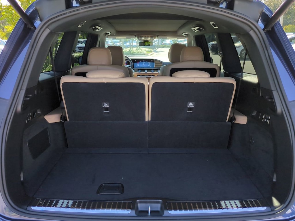 This vehicle Includes the Following Features and Options: 13 Speakers, 3rd row seats: split-bench, 4-Wheel Disc Brakes, 7-Seat Configuration, ABS brakes, Adaptive suspension, Air Conditioning, Alloy wheels, AM/FM radio: SiriusXM, Apple CarPlay®/Android Auto®, Auto High-beam Headlights, Auto tilt-away steering wheel, Auto-dimming door mirrors, Auto-dimming Rear-View mirror, Auto-leveling suspension, Automatic temperature control, Brake assist, Bumpers: body-color, Child-Seat-Sensing Airbag, Compass, Delay-off headlights, Driver door bin, Driver vanity mirror, Dual front impact airbags, Dual front side impact airbags, Electronic Stability Control, Emergency communication system: eCall Emergency System, Exterior Parking Camera Rear, Four wheel independent suspension, Front anti-roll bar, Front Bucket Seats, Front Center Armrest w/Storage, Front dual zone A/C, Front reading lights, Fully automatic headlights, Garage door transmitter: HomeLink, Head restraints memory, Heated and Ventilated Power Front Seats with Memory, Heated door mirrors, Heated front seats, Illuminated entry, Knee airbag, Leather steering wheel, Low tire pressure warning, MB-Tex Upholstery, Memory seat, Navigation system: MB Navigation, Occupant sensing airbag, Outside temperature display, Overhead airbag, Overhead console, Panic alarm, Passenger door bin, Passenger vanity mirror, Power adjustable front head restraints, Power door mirrors, Power driver seat, Power Liftgate, Power moonroof: Panorama, Power passenger seat, Power steering, Power windows, Premium audio system: MBUX, Radio: Burmester® Surround Sound System, Rain sensing wipers, Rear air conditioning, Rear anti-roll bar, Rear dual zone A/C, Rear fog lights, Rear reading lights, Rear seat center armrest, Rear window defroster, Rear window wiper, Reclining 3rd row seat, Remote keyless entry, Security system, Speed control, Speed-sensing steering, Speed-Sensitive Wipers, Split folding rear seat, Spoiler, Steering wheel memory, Steering wheel mounted audio controls, Tachometer, Telescoping steering wheel, Tilt steering wheel, Traction control, Trip computer, Turn signal indicator mirrors, Variably intermittent wipers, Ventilated front seats, Weather band radio, and Wheels: 21" Triple 5-Spoke.
